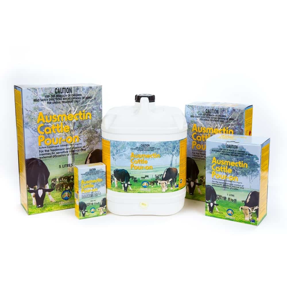 AUSMECTIN® CATTLE POUR-ON is a ready-to-use solution of ivermectin, a member of the macrocyclic lactone class of endectocides, which has a unique mode of action. It acts selectively in invertebrate nerve and muscle cells resulting in paralysis and death of the parasite. AUSMECTIN® CATTLE POUR-ON is indicated for the control and treatment of ivermectin-sensitive gastrointestinal roundworms (including inhibited immature Ostertagia ostertagi), lungworms (Dictyocaulus viviparus), eyeworms (Thelazia spp.), sucking and biting lice, chorioptic and sarcoptic mange mites, buffalo flies (Haematobia irritans exigua) and cattle ticks (Boophilus microplus).