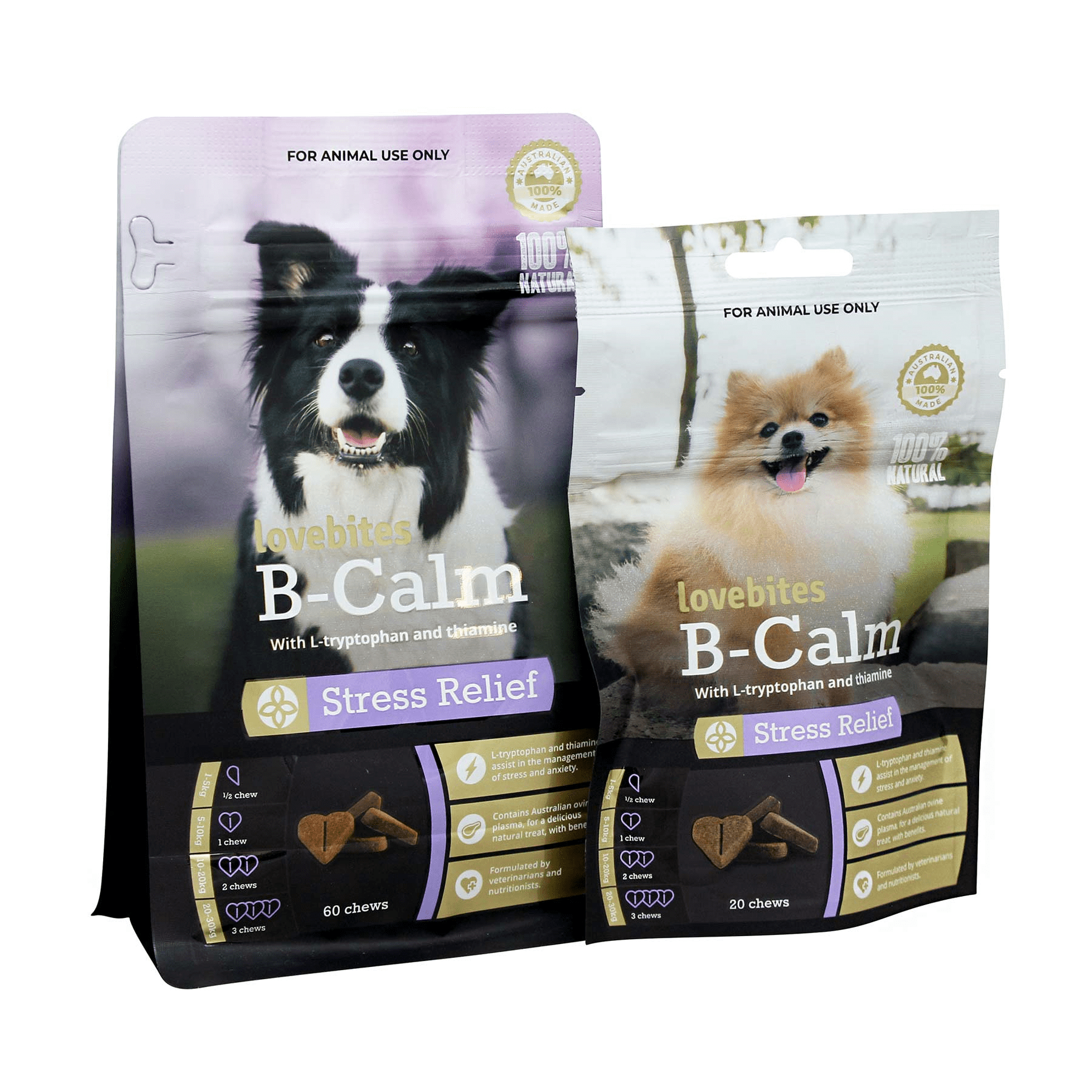 Provide 1 chew per 10kg of bodyweight, daily. It is recommended dogs receive B-Calm on an ongoing basis for best results in anxiety and stress management.