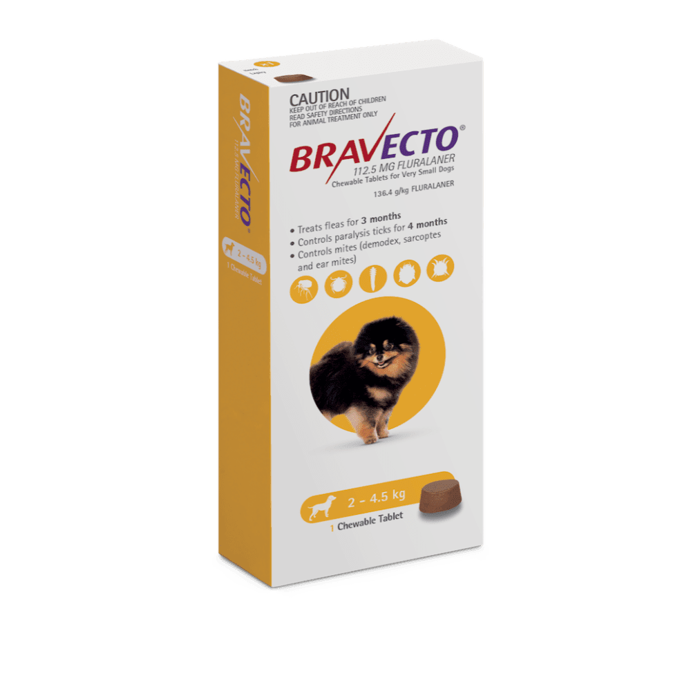 Bravecto Chewables for Dogs is the only oral chew to deliver 3 months flea and 4 months paralysis tick protection for dogs in a single dose. It eliminates fleas within 8 hours of administration and provides effective control of pre-existing paralysis tick infestations within 24 hours. It also treats ear mites. Bravecto can be used in puppies from 8 weeks of age weighing greater than 2kg. It is also safe for use in breeding, pregnant, and lactating dogs.