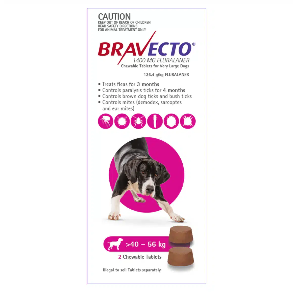 Bravecto Chewables for Dogs is the only oral chew to deliver 3 months flea and 4 months paralysis tick protection for dogs in a single dose. It eliminates fleas within 8 hours of administration and provides effective control of pre-existing paralysis tick infestations within 24 hours. It also treats ear mites. Bravecto can be used in puppies from 8 weeks of age weighing greater than 2kg. It is also safe for use in breeding, pregnant, and lactating dogs.