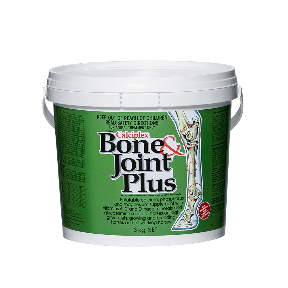 An adequate intake of calcium, phosphorus and magnesium is required for healthy bone development, optimal muscle function and to meet the demands during pregnancy and lactation in mares. Calciplex Bone and Joint Plus is a highly palatable supplement containing calcium, phosphorus, magnesium, vitamins and minerals to support healthy bones, joints and muscles in growing and working horses. Glucosamine, a natural component of cartilage, tendons and ligaments, is also added to provide a lubricating effect in the joints and joint fluid.