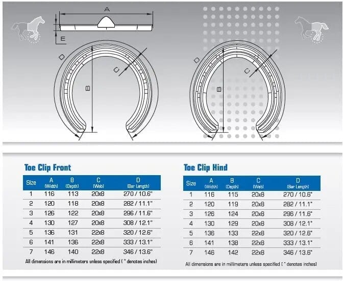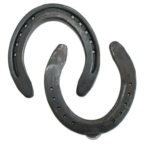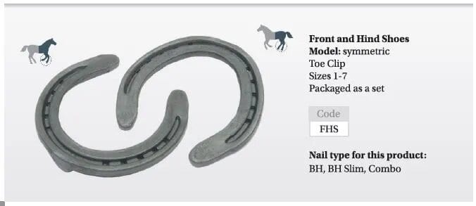 The Flat Hack Shoe (FHS) range is made using carbon steel and a unique manufacturing process which maintains web width throughout the entire bars length. This results in greater coverage at the heels, compared to a traditional flat shoe. This easily shaped shoe is packaged in sets (front and hind top clipped versions). Size 1-4 are a 20x8mm cross section whilst the larger shoes in the range (5,6,7) are a heavier 22x8mm section.