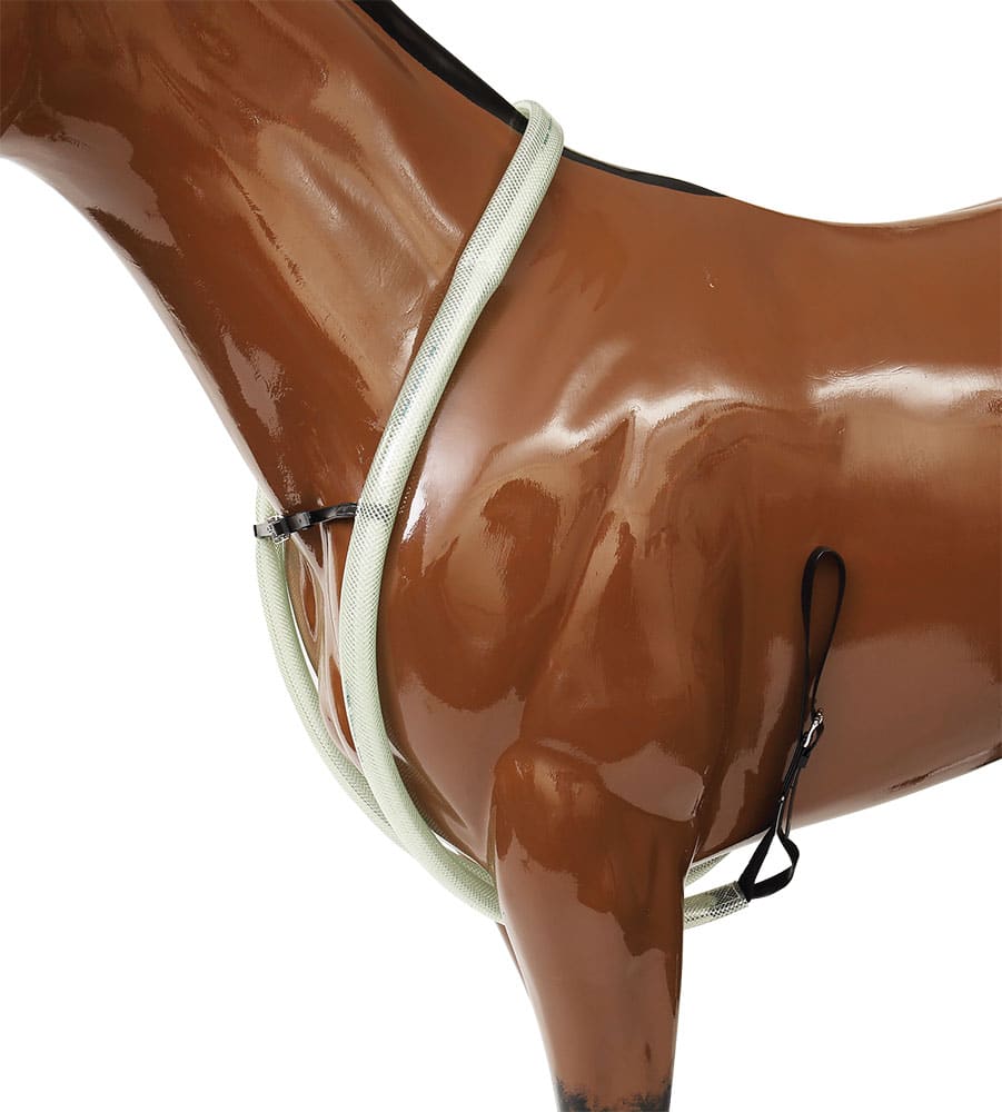 This model is fitted by looping them over the horse’s wither and behind the elbow as shown. A strap across the front of the chest helps to keep the Straighteners in the correct position. The buckle end attaches to the sulky shafts.