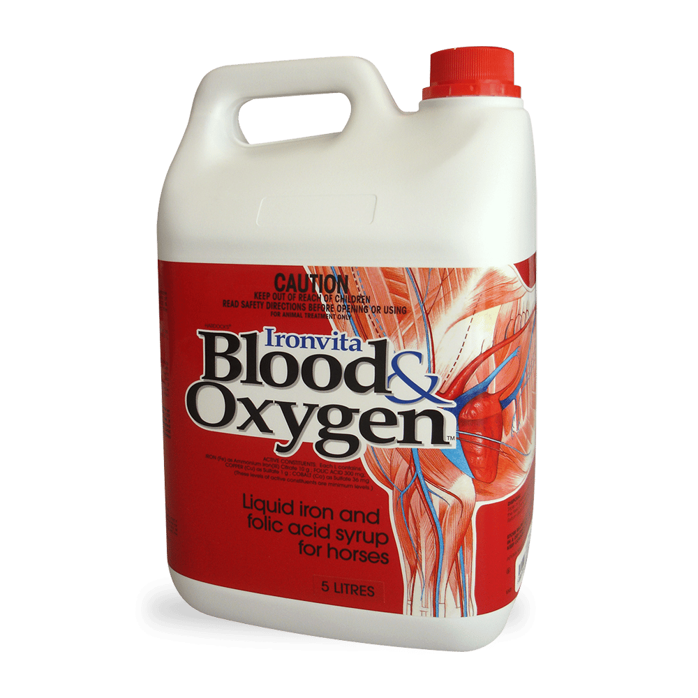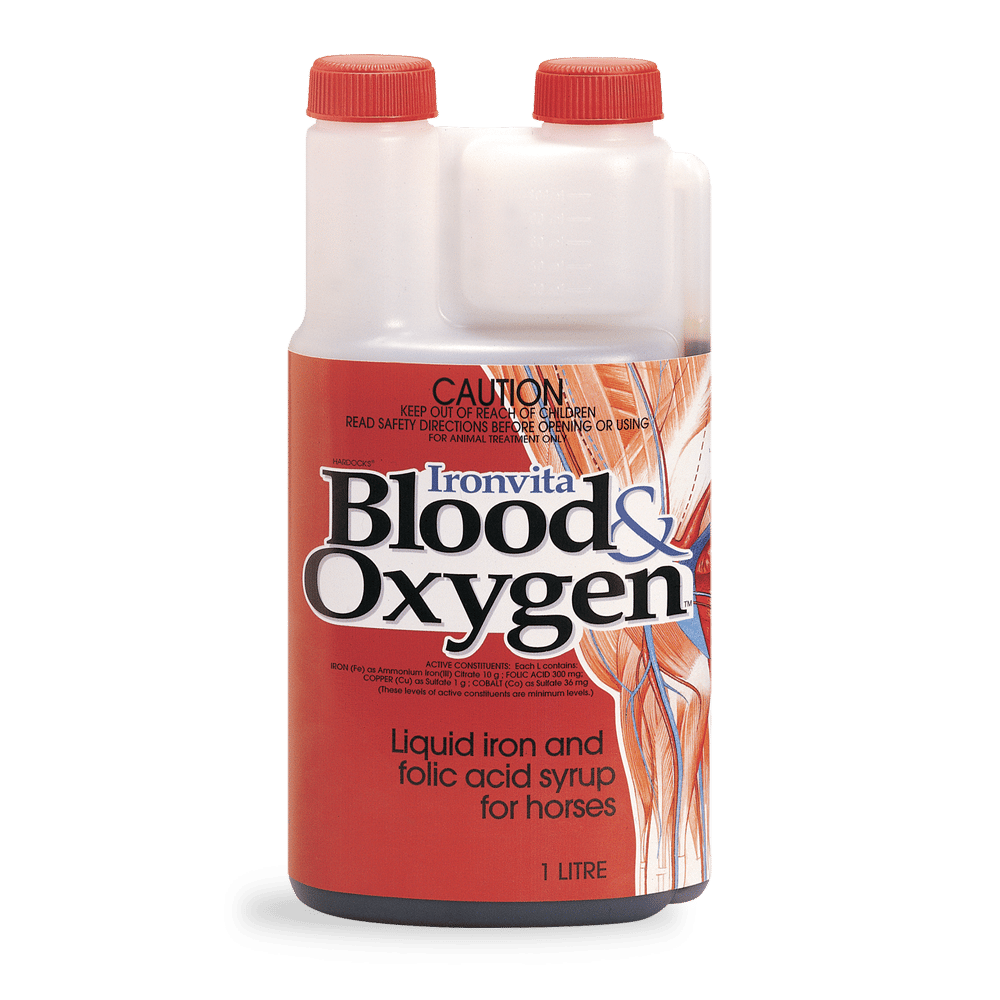 A palatable supplement for the prevention and treatment of deficiency anaemia in horses. IRONVITA BLOOD and OXYGEN contains iron, copper and cobalt, the three essential trace-minerals required for haemoglobin synthesis complemented by the vitamin, folic acid. Studies have shown that stabled horses, and those in full work, such as racehorses and harness horses, eventers, polo and endurance horses especially under heavy sweat conditions, require considerably greater amounts of these trace-minerals and folic acid than are normally available in feed.