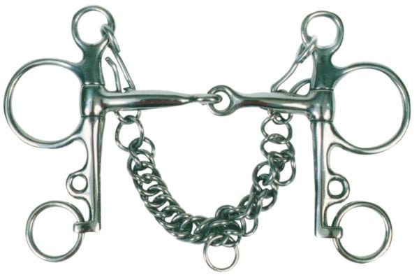 Stainless Steel. Single jointed mouth pelham bit complete with double link curb chain.
