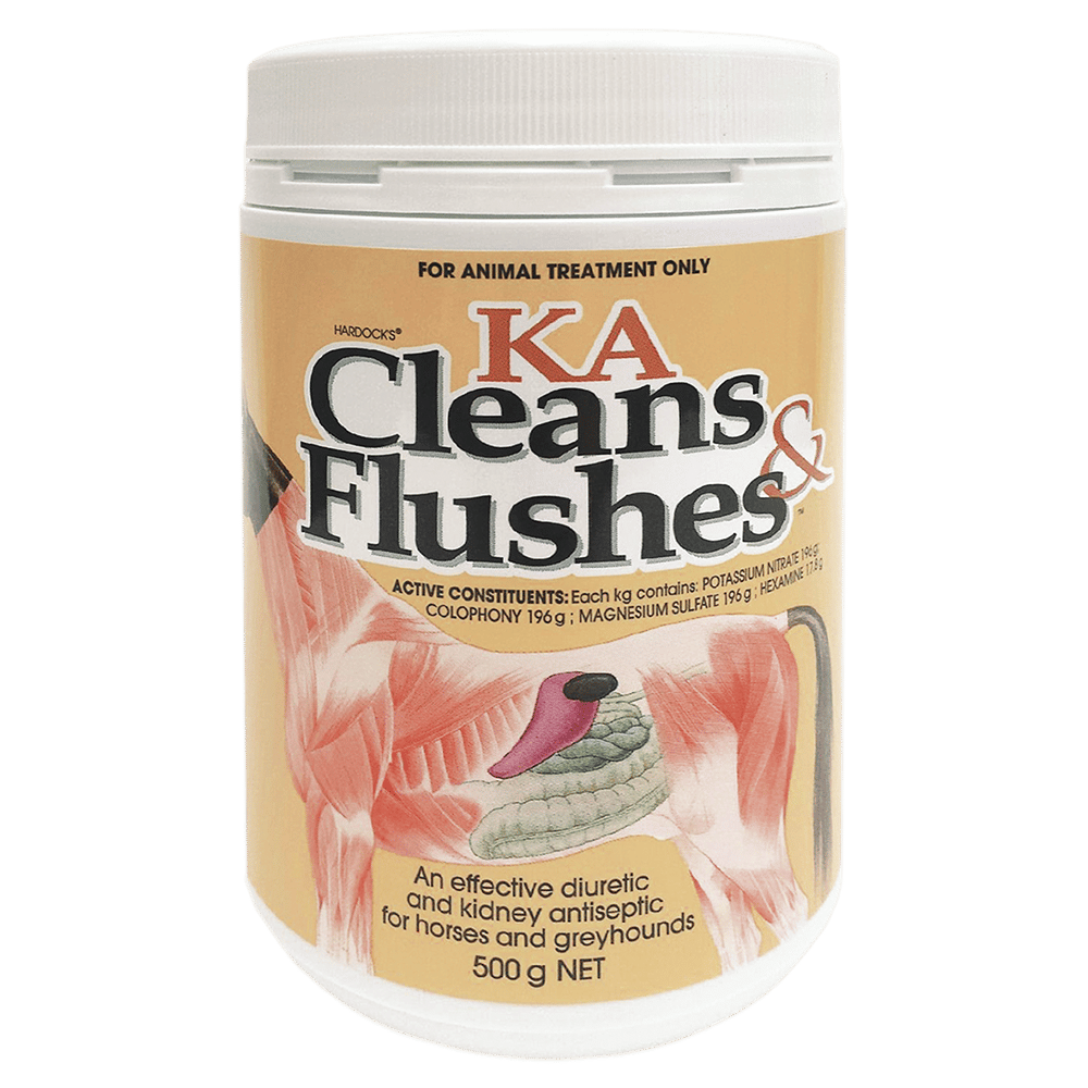 A time-honoured mild diuretic and urinary antiseptic that assists the blood clearing action of kidneys by increasing the volume and flow of urine, and acts to flush the body of harmful compounds accumulated during exercise. As an antiseptic, it acts by effectively cleansing of the urinary tract to reduce the risk of low grade bladder infection cystitis. Thus, K.A. CLEANS and FLUSHES assists in promoting the action of the kidney, helping to increase urinary flow to eliminate problems such as oedema of the lower limbs, which often occurs in horses on high grain diets after hard work or racing.
