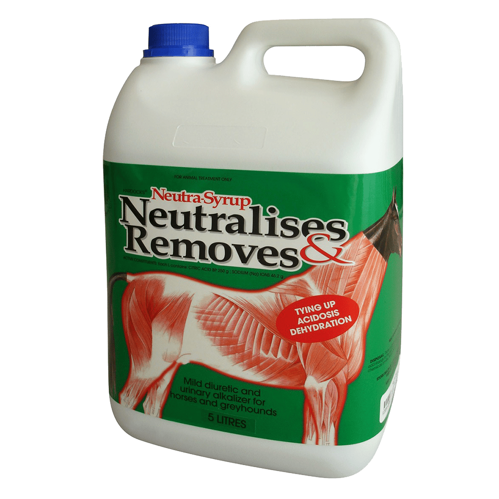 A palatable mild diuretic that increases the volume of urine excreted, increases the thirst and fluid intake, whilst providing a beneficial urinary alkalising action to flush the kidneys of excess acid after fast exercise. NEUTRA-SYRUP NEUTRALISES and REMOVES assists in the treatment and prevention of dehydration by encouraging a horse to drink more water, especially when administered routinely after training. When given on fast work days, it helps to neutralise and flush the system of lactic acid or correct ‘acidosis’ due to the accumulation of excess acid within the blood, after fast, anaerobic exercise especially in unfit horses in early training.