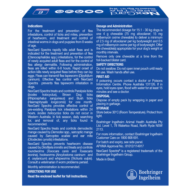 NexGard Spectra is a monthly treatment in the form of a beef flavoured chew which provides your dog with protection against most internal and external parasites of dogs in Australia.