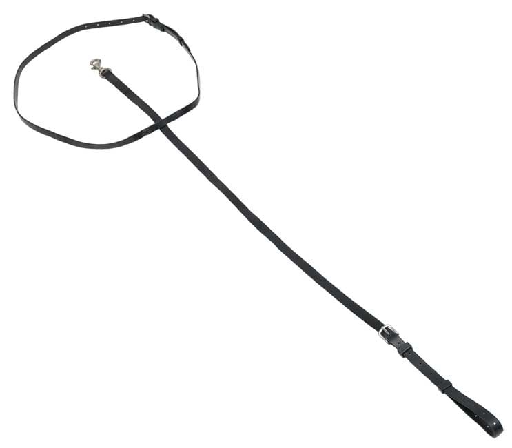 This model is a regular “standing martingale” design and includes a neck strap to help keep it centred. The buckle end is looped around the girth, while the snap is connected to the centre ring of the head halter.