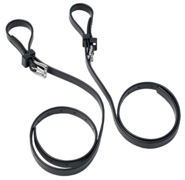 Sometimes referred to as “safety straps”, they thread through the loop on the girth buckle, and are then wound around the sulky shafts and buckled tightly to keep them securely fastened to the harness.