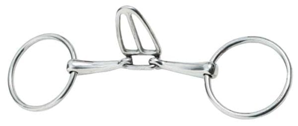 Stainless steel ring bit with tongue control plate that prevents the horse from putting his tongue over the bit.